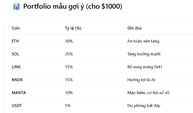 🔁 Có thể linh hoạt điều chỉnh tùy khẩu vị rủi ro. Nếu bạn thích an toàn hơn → tăng ETH, LINK; thích mạo hiểm → thêm các altcoin mới ra mắt.