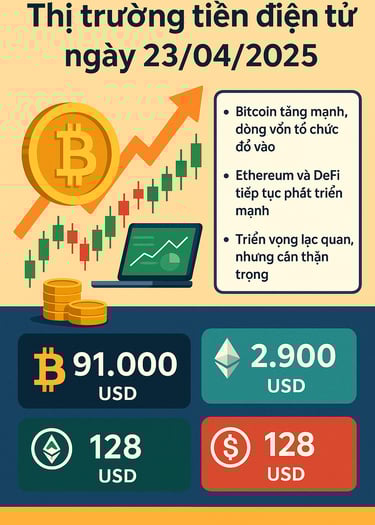 Thị trường tiền điện tử ngày 23/04/2025 đang trong giai đoạn tăng trưởng mạnh mẽ, với sự hỗ trợ từ các yếu tố kinh tế vĩ mô tích cực và dòng vốn tổ chức đổ vào. Tuy nhiên, nhà đầu tư cần theo dõi sát sao các diễn biến chính sách và thanh khoản để điều chỉnh chiến lược đầu tư phù hợp.