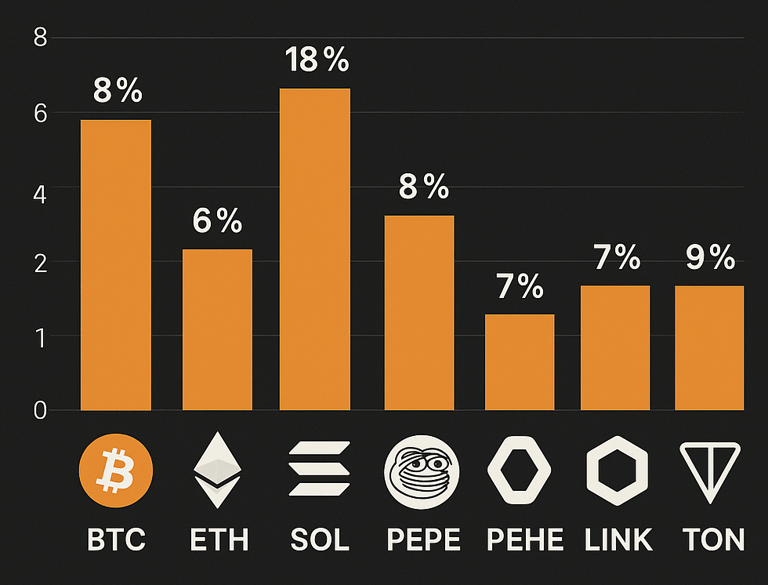 Pepe (PEPE): Các token meme như PEPE có sự hồi phục tốt. PEPE tăng khoảng 18% trong tuần, phản ánh tâm lý ưa thích rủi ro của thị trường trong giai đoạn này.