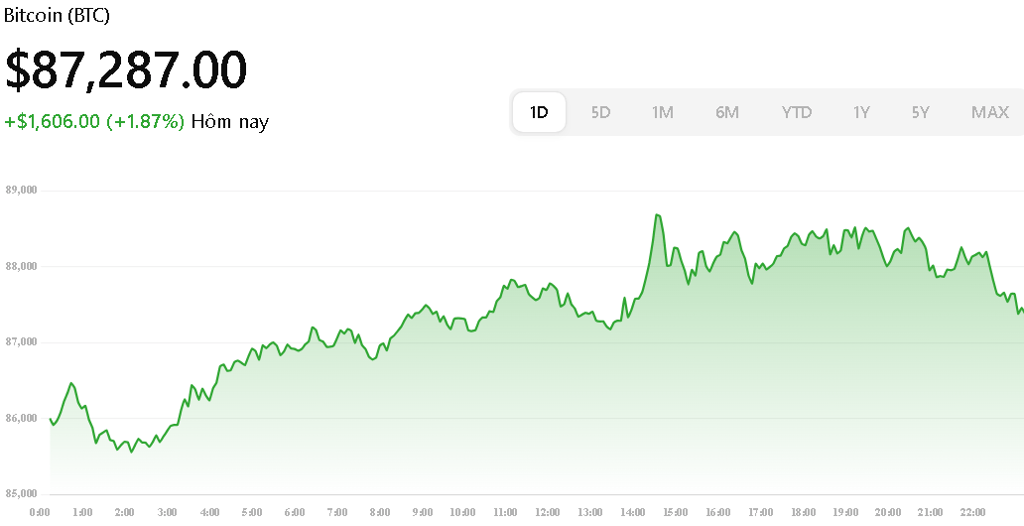 Giá Bitcoin hiện tại là khoảng 87.287 USD, tăng 1.606 USD (1,87%) so với phiên đóng cửa trước đó.